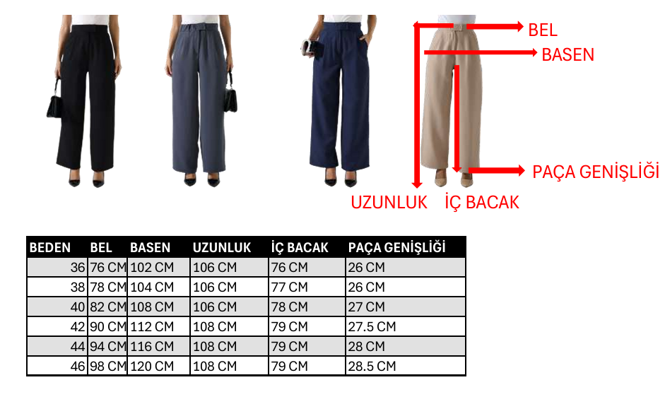 Rahatlığı ve şıklığı bir araya getiren Palazzo pantolon, geniş paça kesimiyle vücuda nefes aldırır ve özgür bir hareket alanı sunar. Akıcı dokusu ve yüksek bel formu sayesinde hem boyu uzun gösterir hem de modern bir siluet oluşturur.