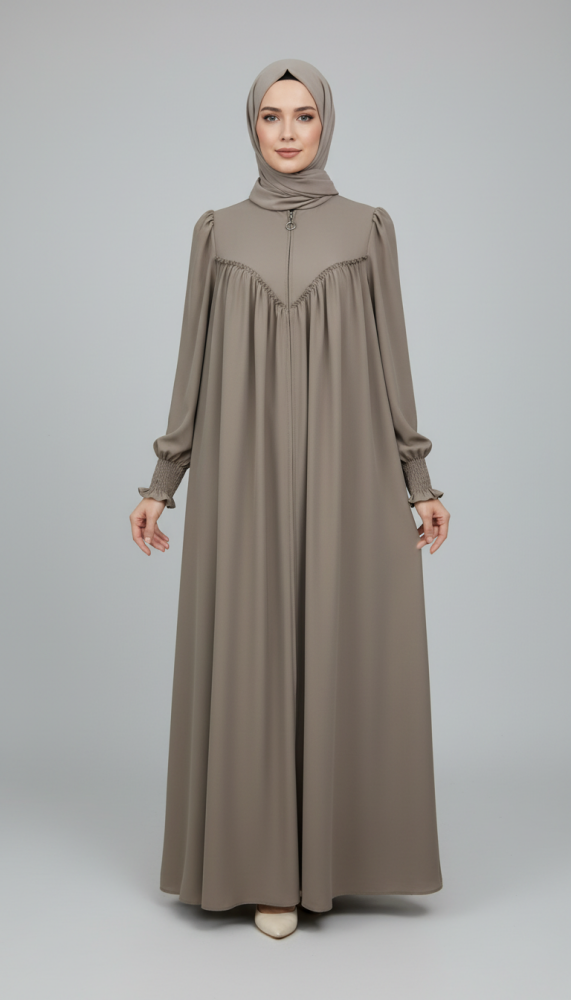 Tam fermuarlı, krep kumaş ferace dört mevsim kullanıma uygundur.